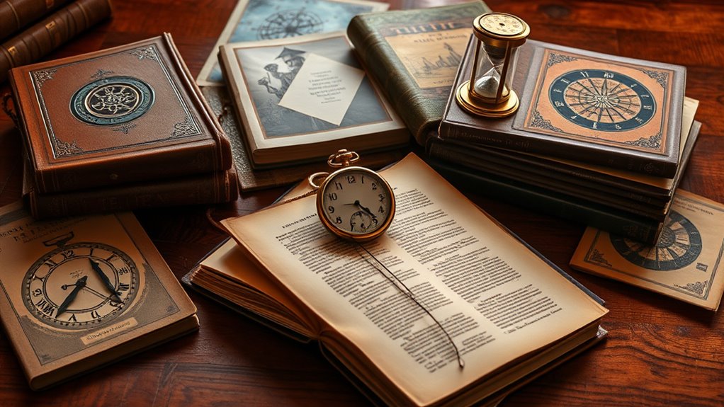 Books about time travel take you through fascinating worlds where you explore different eras, face paradoxes, and challenge perceptions of reality. These stories often blend authentic historical details with imaginative scenarios, creating immersive experiences. From Victorian London to future societies, they balance accuracy with creative twists that make each journey unique. If you want to discover more about how these stories push the limits of imagination and realism, keep exploring further.