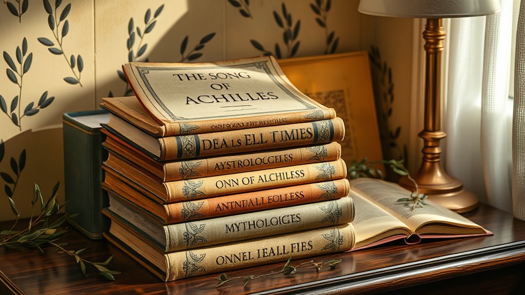 If you’re interested in mythology retellings, explore books that delve into Greek heroes and their adventures. You might enjoy *D’Aulaires’ Book of Greek Myths*, which offers engaging stories of gods and heroes, or *Percy Jackson & the Olympians* series, blending modern adventures with Greek mythology. These books bring Greek legends to life, making mythology accessible and exciting for you, while expanding your knowledge beyond *The Song of Achilles*.