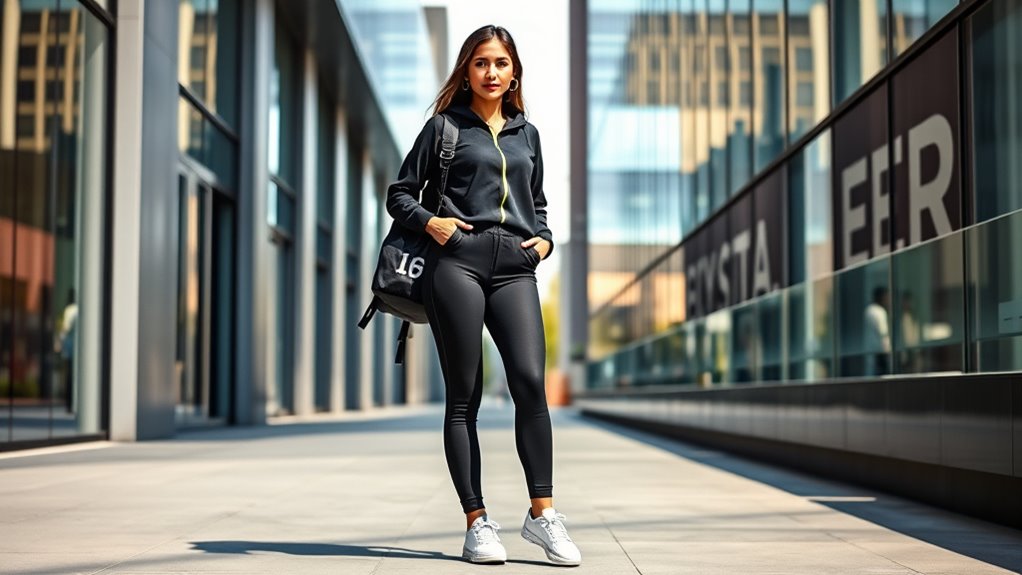 Layering is another effective strategy. You can add a structured blazer or a tailored vest over your hoodie or leggings to create a more refined silhouette. This not only enhances your style but also adds functionality, allowing you to stay warm or cool as needed. When choosing pieces, look for those made from sustainable fabrics for eco-conscious appeal. Incorporate versatile accessories that can be mixed and matched across different outfits, so you get the most out of each item. A well-chosen accessory can elevate your look without adding bulk or discomfort, giving you a polished appearance on the go.