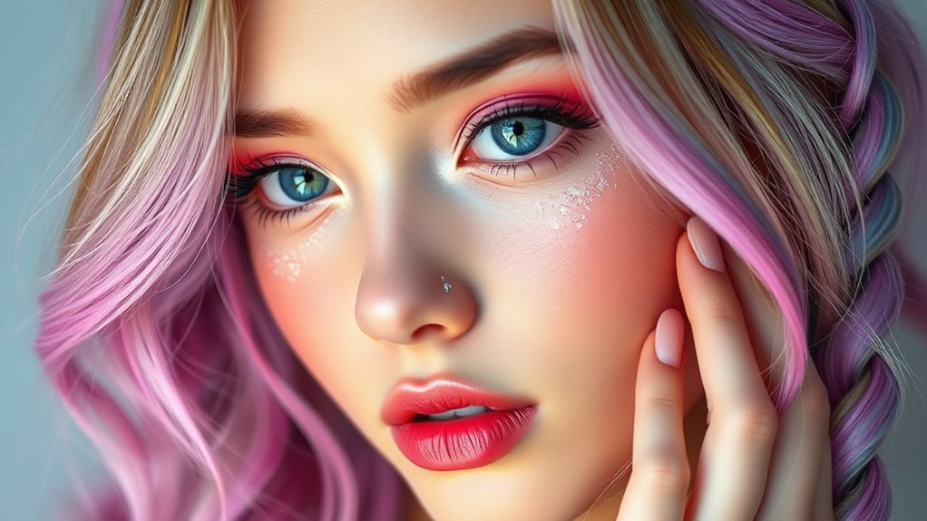 To achieve anime-inspired beauty, start with a consistent skincare routine that leaves your skin glowing and smooth, like a fresh anime character. Focus on cleansing, hydrating, and protecting your skin with sunscreen. For makeup, enhance your eyes with colorful shadows, winged eyeliner, and false lashes to create a lively, expressive look. Finish with glossy or bold lips that match your character’s style. Keep experimenting to uncover your unique, playful style—there’s plenty more to explore on this fun journey.