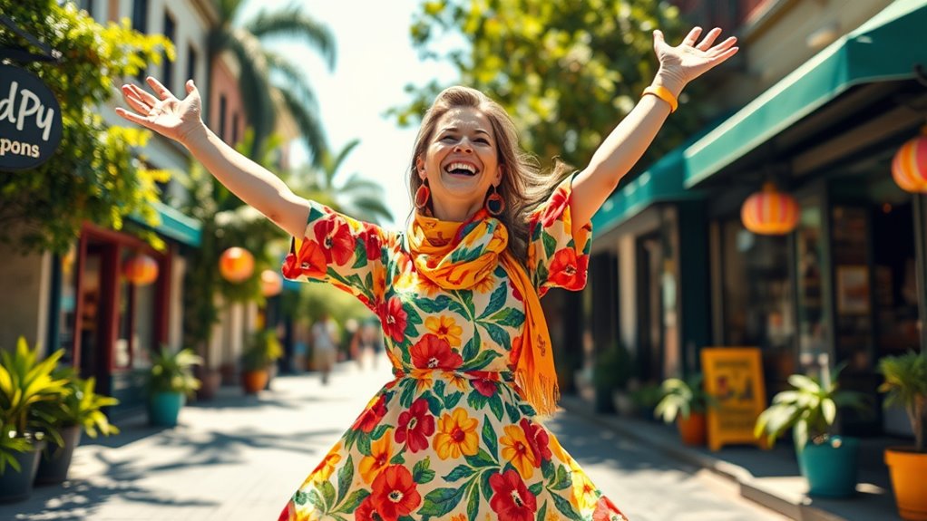 Imagine your wardrobe as a garden where each color and style blooms with potential. While fashion psychology and color psychology suggest your choices can influence mood, there’s limited scientific proof linking them to long-term happiness. You can cultivate daily joy by dressing intentionally, but lasting happiness depends on broader factors. Think of fashion as a vibrant, uplifting corner of your mental landscape, not the entire garden.