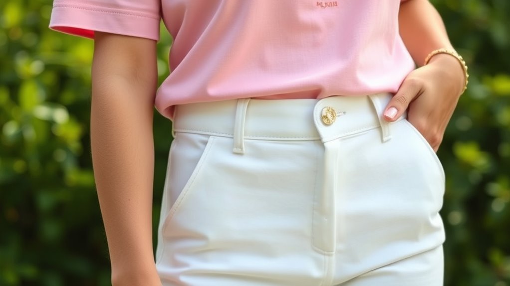 For office wear, you can take your feminine polo shirt to a more professional level. Choose neutral shades like white, navy, or pastel tones, and pair your polo with tailored trousers or a pencil skirt. A tucked-in polo instantly creates a polished appearance, especially when combined with a blazer or cardigan. Finish the outfit with sleek loafers, flats, or low heels, and minimal jewelry to keep the look professional but approachable. The polo’s breathable fabric guarantees comfort during long workdays, while its versatile style keeps you looking sharp. This makes it easy to go from a morning meeting to a quick coffee break without changing outfits. If your office environment allows, roll up the sleeves or knot the hem for a slightly more relaxed, yet still professional, feel. Incorporating prophetic dreams into your understanding of subconscious messages can add an interesting layer to how you interpret your personal style and daily choices.