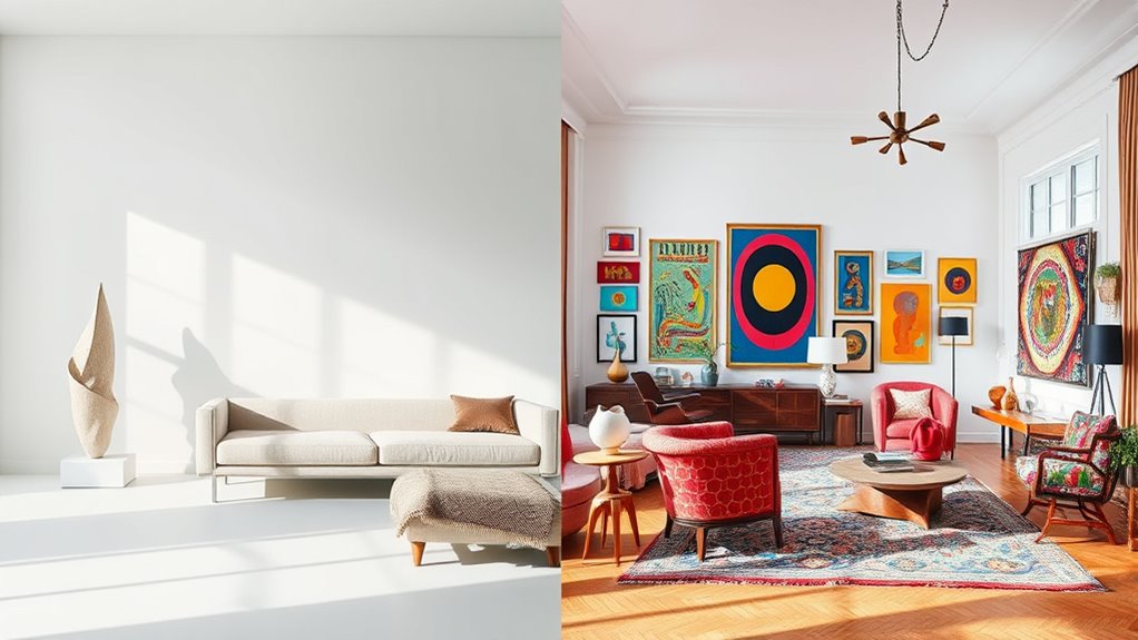 Thinking of switching styles? Well, why not blend them like a smoothie—layered textures and color harmony are your secret ingredients. Start by adding a few statement pieces to a minimalist base, then gradually introduce bold accents and patterns. It’s about balance, not chaos. Embrace the art of curated excess or simplified elegance, and remember: your space should reflect your personality, not just a decorating rulebook.