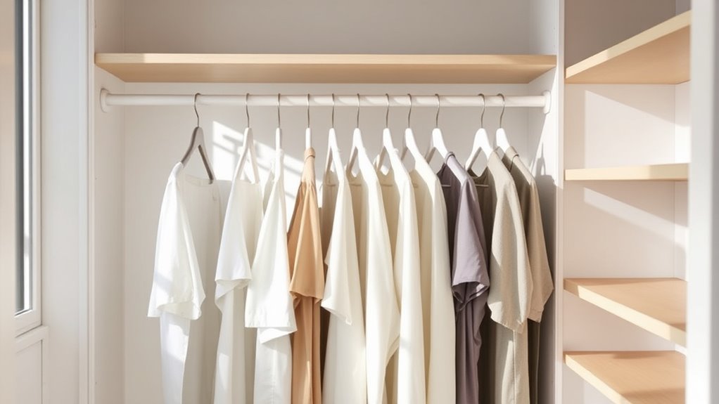 Once you start, you’ll notice how cluttered spaces create mental clutter, making it harder to recognize what you actually need. Decluttering your wardrobe involves sorting through your clothes, removing items that no longer fit, suit your style, or serve your daily activities. As you do this, you might realize how much time you previously spent choosing what to wear or how often you wore certain pieces. The process can be challenging, especially when you’re faced with clothes that carry memories or have sentimental value. But remind yourself that clearing out doesn’t mean losing those memories; it means creating a more intentional wardrobe that reflects who you are now. A well-curated capsule wardrobe fosters confidence, saves time, and reduces stress. Exploring wardrobe organization options and smart storage solutions can further streamline this process.