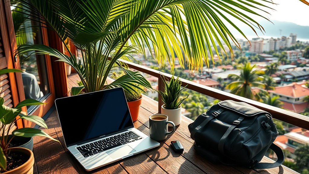 Balancing work and exploration is a constant challenge, but with proper planning, it becomes second nature. Schedule dedicated work hours and stick to them, but also carve out time to explore your surroundings. This balance keeps you energized and prevents burnout. Staying connected is essential, so invest in a portable Wi-Fi device or local SIM cards to guarantee steady internet access. Building a network of fellow digital nomads can also be incredibly helpful — they can offer advice, support, and even companionship during your travels.
