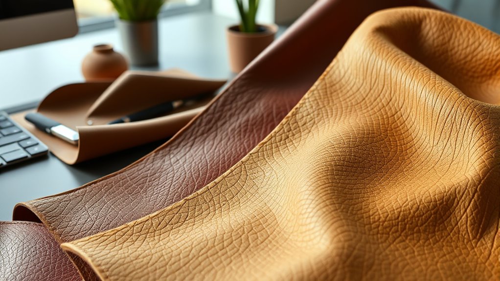 So, here you are, marveling at how nature’s leftovers and tiny organisms are revolutionizing your leather choices. Ironically, the very waste and unlikely sources that once cluttered our environment now craft your stylish accessories. As you embrace these innovations, remember it’s almost poetic—what once caused pollution now becomes part of your fashion statement. In the end, it seems the future of leather isn’t about harming animals but about turning trash into treasure.