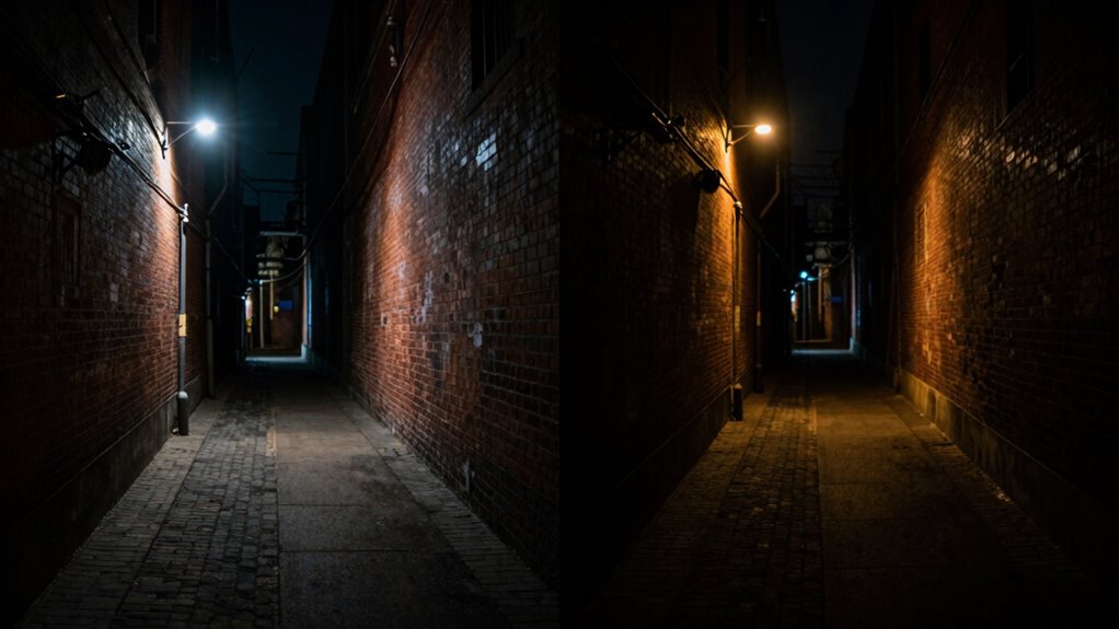 Sensor size plays a significant role in low-light performance, but it doesn’t operate in isolation. Many fall into sensor size myths, believing bigger sensors automatically mean better low-light photos. However, factors like sensor technology, noise reduction, and image processing are equally vital. Your megapixel obsession can also mislead you—more megapixels on small sensors often mean increased noise, not sharper images. Remember: