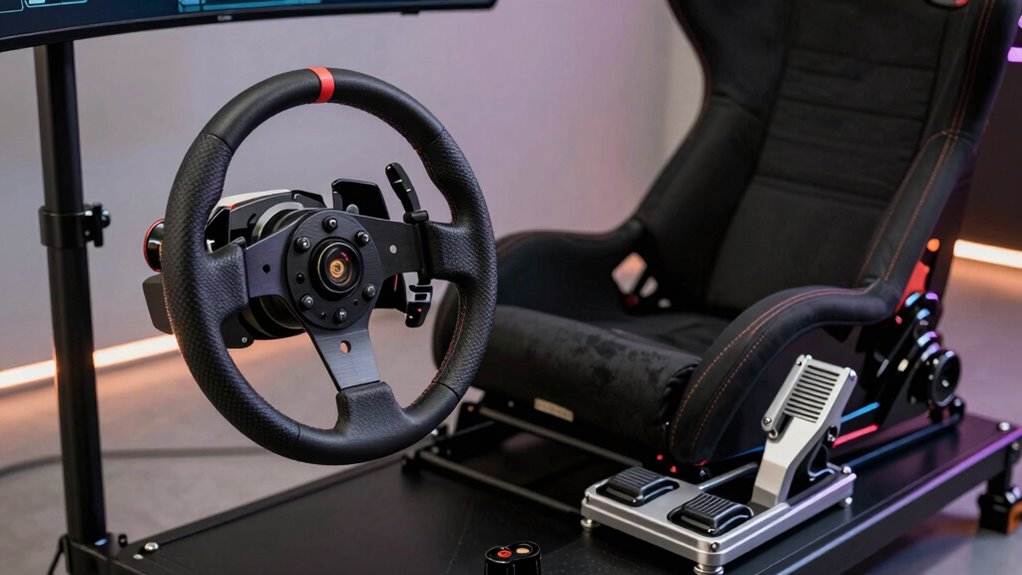 A typical sim racing setup consists of several key components that work together to create an immersive experience. The core is your racing wheel, often equipped with force feedback, which simulates road feel and enhances realism. Force feedback allows you to sense the texture of the track, steering resistance, and car behavior, making each turn more intuitive. Many setups incorporate virtual reality headsets, providing a 360-degree view of your environment and increasing immersion. Pedals for throttle, brake, and clutch give you precise control, while a sturdy rig anchors everything securely. These parts combine to deliver a realistic driving sensation, immersing you fully in the racing world. Understanding these main components helps you build a setup tailored to your experience level and goals, especially considering how contrast ratio affects the clarity and depth of visual feedback during gameplay.