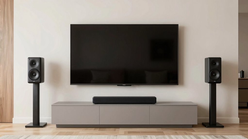 Many people make common mistakes when setting up their center channel, which can considerably impact sound quality. One mistake is placing the speaker too high or too low, disrupting dialogue clarity. Another is positioning the speaker off-center, causing uneven sound distribution. Lastly, blocking the speaker with furniture or decor can muffle audio and reduce intelligibility. To avoid these issues, make sure your center channel is at ear level and centered directly above or below your TV. Keep the speaker unobstructed for ideal sound projection, and align it directly with your main listening position. Proper speaker placement is critical for clear dialogue and balanced audio. Correct speaker placement is essential for optimal sound quality. Avoid these common pitfalls, and you’ll improve your home theater experience greatly.