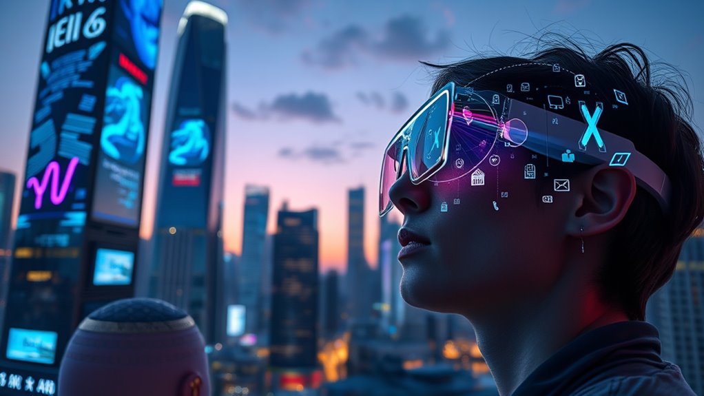 Futuristic movies about augmented reality show worlds where digital and physical lives blend seamlessly. You’ll see characters using AR glasses or contact lenses that overlay virtual info onto real environments, transforming daily routines, social interactions, and entertainment. These films explore how virtual identities influence self-perception and society, while also highlighting risks like privacy or disconnection. If you keep exploring, you’ll discover how these visions shape our future and the technology driving them.