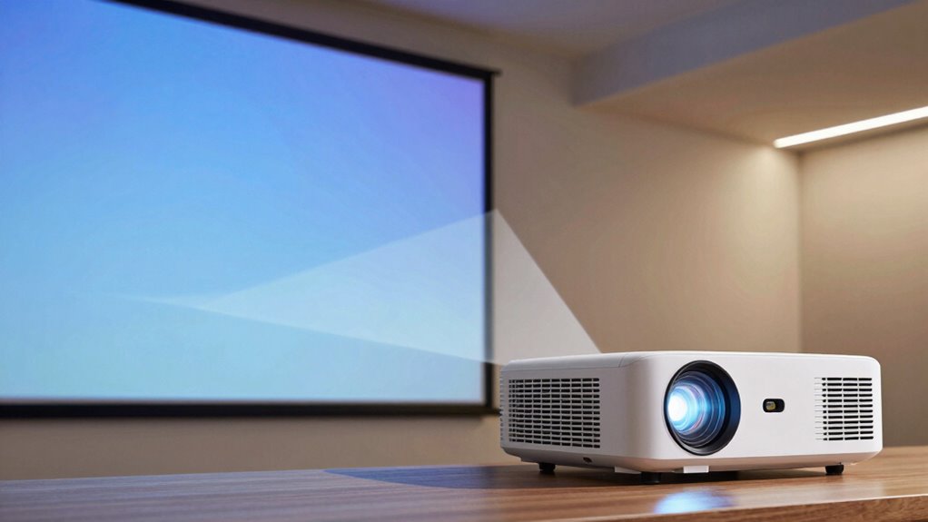 Room lighting profoundly impacts image quality when you use keystone correction. Ambient glare and screen reflection can cause the image to appear washed out or less sharp, reducing clarity. Bright lights or reflections from windows and walls increase glare, making it harder to see fine details. To maintain ideal image quality, control room lighting and minimize reflective surfaces, ensuring your keystone-adjusted image stays bright, clear, and easy to view.