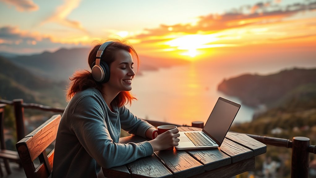 Like a compass guiding your journey, certain music genres draw digital nomads together. You’ll find indie, acoustic, and chillhop often topping travel playlists because they evoke relaxation and freedom. These genres help you stay energized and focused while exploring new places. You may also enjoy world music for its cultural richness. Your favorite travel playlist becomes a reflection of your adventurous spirit, blending melodies that match your nomadic lifestyle perfectly.