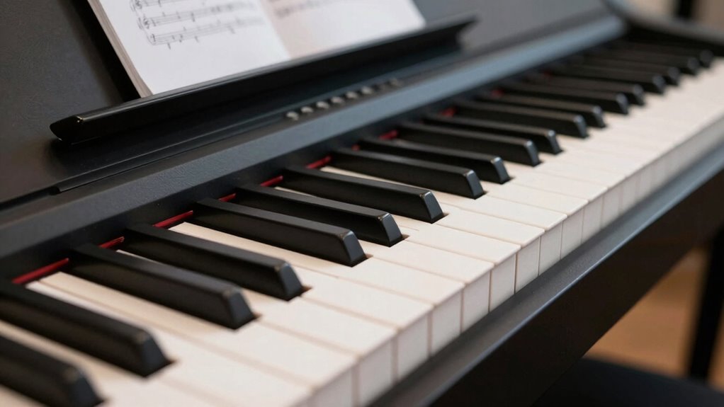 Weighted keys are piano keys designed to simulate the feel of an acoustic piano, providing resistance when pressed. This feature directly influences your piano touch, making it feel more natural and expressive. When you press a weighted key, you’ll notice a certain amount of key resistance that mimics an acoustic’s action, giving you better control over dynamics and phrasing. This resistance is essential because it helps develop your finger strength and playing technique, especially if you’re *shifting into* an acoustic. Without proper key resistance, your playing may feel less responsive, making it harder to achieve nuanced performances. Additionally, the importance of consistent touch in creating a more authentic playing experience cannot be overstated. So, when shopping for a digital piano, consider whether the weighted keys offer a realistic piano touch, as this *considerably* impacts your overall playing experience.