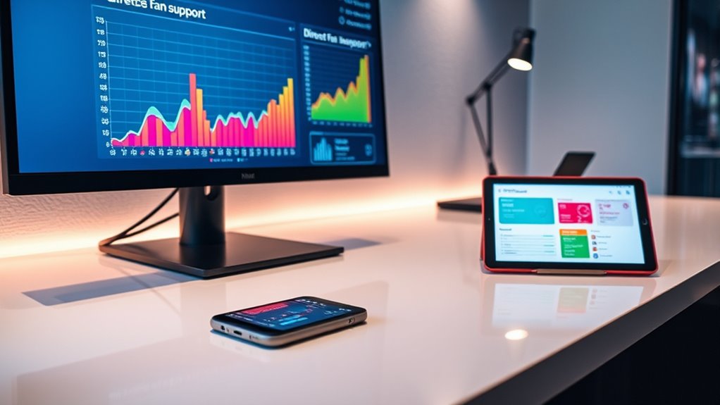 Direct fan support platforms let you connect with your supporters directly, without relying on traditional intermediaries like ad networks or agencies. These platforms enable you to receive personalized support through subscriptions, one-time payments, and exclusive content, helping you build stronger relationships and monetize your creativity more effectively. They also provide valuable analytics to refine your approach and foster community engagement. If you want to uncover how these tools can transform your relationship with fans, keep exploring.