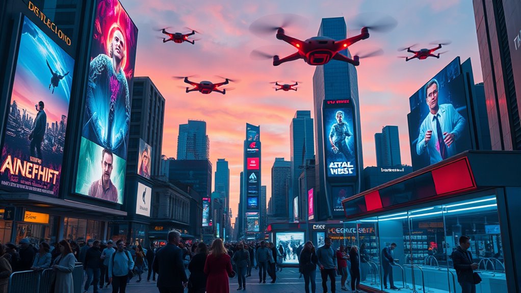 In 2025, movie marketing has evolved from traditional ads like TV spots and billboards to immersive augmented reality experiences and influencer collaborations. You can now interact with movie content through your smartphone, stepping into exclusive scenes or trying on costumes virtually. Influencers help create buzz, making campaigns feel authentic and engaging. This shift transforms viewers from passive spectators into active participants. Keep exploring to discover how these innovative strategies are shaping your movie-going experience.