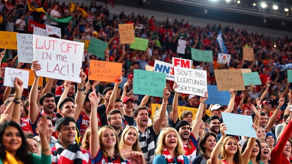 You’ll find that around the world, fans express support through creative cheer phrases and innovative rally cries. In Brazil, crowds chant “Vai, Corinthians!” with passion, while in Japan, supporters spin banners and shout “Zenkoku! Zenkoku!” in unison. In Italy, fans sing elaborate chants, and in Nigeria, rhythmic drum beats energize the crowd. These unique expressions boost team morale and create unforgettable atmospheres, uniting fans through their vibrant, cultural support.