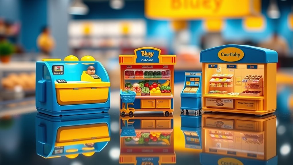 Imagine a colorful Bluey supermarket bustling with tiny shoppers—perfect for different ages. I’ve found that smaller, simpler sets are ideal for toddlers, offering easy-to-handle pieces and bright visuals. More complex sets with detailed accessories suit older children, sparking imaginative play. So, depending on your child’s age, you can choose a set that offers both fun and development, creating a lively, engaging play environment.