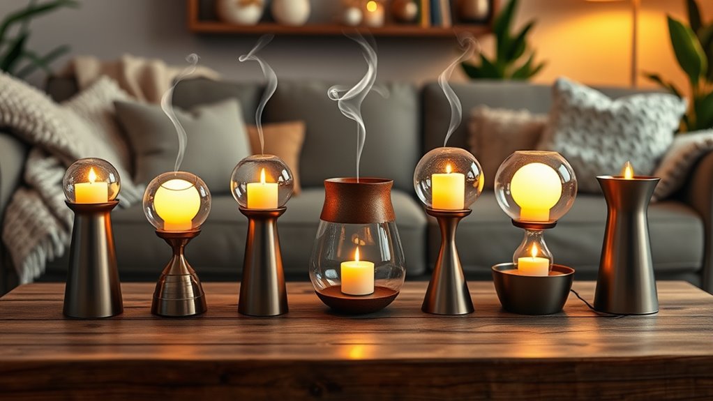 Think of modern candle warmer lamps as savvy travelers—always seeking smarter ways to conserve energy. Many now feature energy-saving modes, automatic shut-offs, and LED bulbs that use less power. These thoughtful features help you enjoy your favorite scents without running up your electric bill. I’ve noticed that choosing models with these features not only keeps my home cozy but also aligns with my eco-friendly goals.