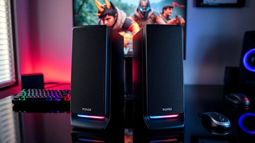 Choosing desktop speakers that are easy to set up can make a huge difference in creating a seamless gaming experience. I look for models with simple connection options like Bluetooth, USB, or AUX, which guarantee quick, hassle-free installation. Wireless capabilities and minimal cables help reduce clutter and speed up the setup process. Clear, straightforward instructions or companion apps are essential for easy configuration, so I don’t waste time troubleshooting. Plug-and-play features are a big plus, as they eliminate the need for complex driver installations or software setups. Ergonomic controls like touch panels or remote controls also make adjustments quick and simple, so I can focus on gameplay instead of fiddling with settings. Overall, an easy setup means more time gaming and less time fussing over tech.