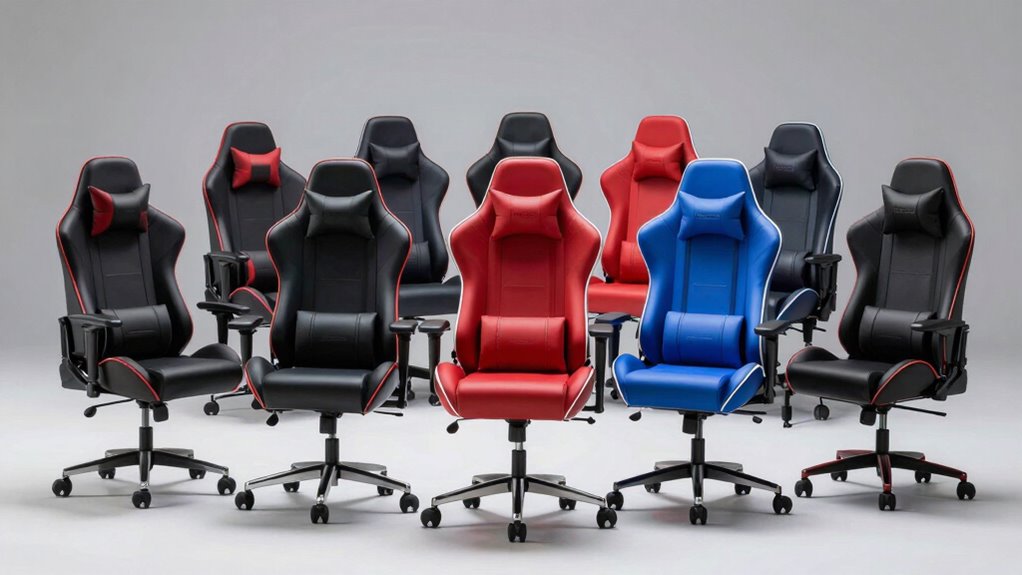 Choosing a premium ergonomic gaming chair means paying close attention to adjustable support features, as they directly impact your comfort and posture during long gaming sessions. An adjustable lumbar support lets you customize the depth and height, reducing lower back strain. Multi-directional armrests can be modified in height, width, and angle to promote proper shoulder and wrist alignment. A tilt mechanism with lockable positions allows you to set the recline angle for personalized comfort and spinal health. Seat height adjustments ensure your feet rest flat on the floor and align with your desk, promoting good posture. Extended footrests support leg circulation and reduce fatigue during extended gaming marathons. These adjustable features work together to create a tailored, ergonomic experience that minimizes discomfort and maximizes focus.