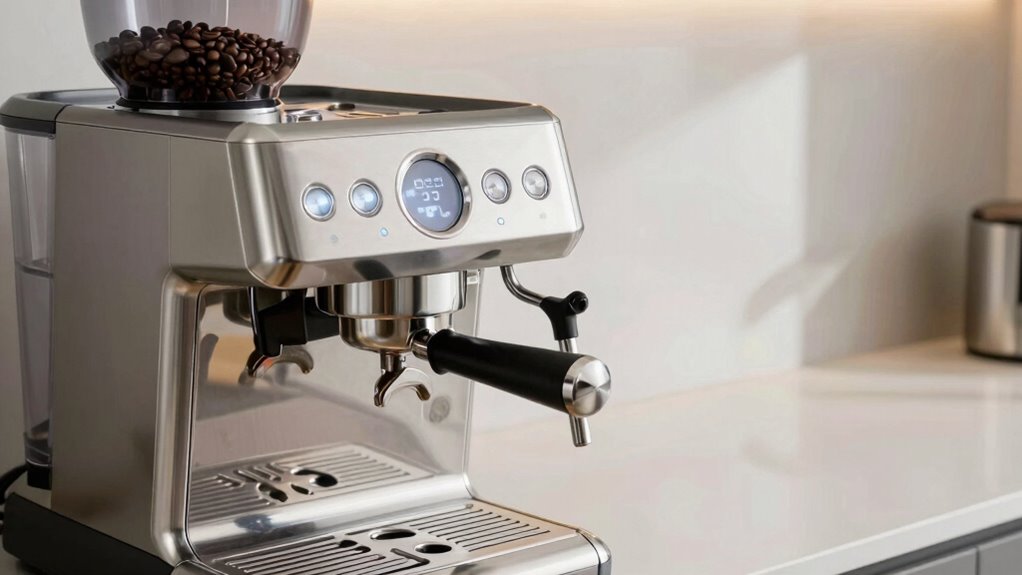 Integrated grinders need regular cleaning and occasional recalibration to stay in top shape. I recommend brushing out coffee grounds daily and running a cleaning cycle with a grinder-specific cleaner every few weeks. You should also check and replace burrs or blades if they become dull. Keep the hopper filled with fresh beans and wipe down the exterior regularly. Proper maintenance guarantees your machine grinds consistently and lasts longer.