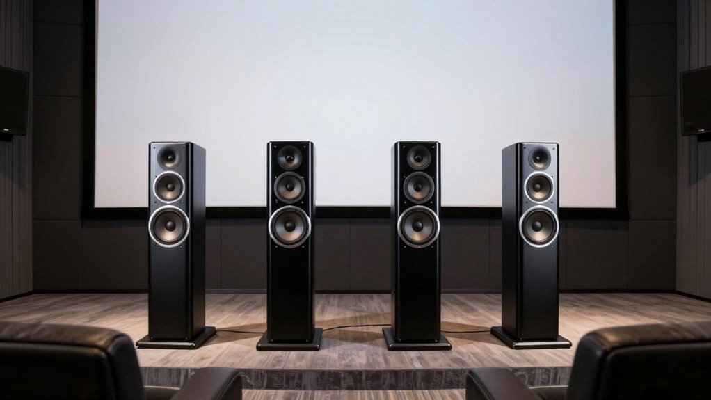 Achieving a balanced sound quality with floorstanding speakers is essential for a home theater experience, as it guarantees that high, mid, and low frequencies come through clearly without one overpowering the others. A wide frequency response, typically from 70Hz to 20kHz or higher, helps create a fuller, more natural soundstage. High-quality drivers like silk dome tweeters and balanced woofers ensure smooth shifts and accurate audio reproduction. Proper calibration and matching tonal characteristics with your room acoustics are vital for harmony. Additionally, selecting speakers that can handle sufficient power levels, such as 125W RMS or more, ensures sound remains clear and distortion-free during dynamic moments. Overall, balancing these factors results in a richer, more immersive home theater experience.