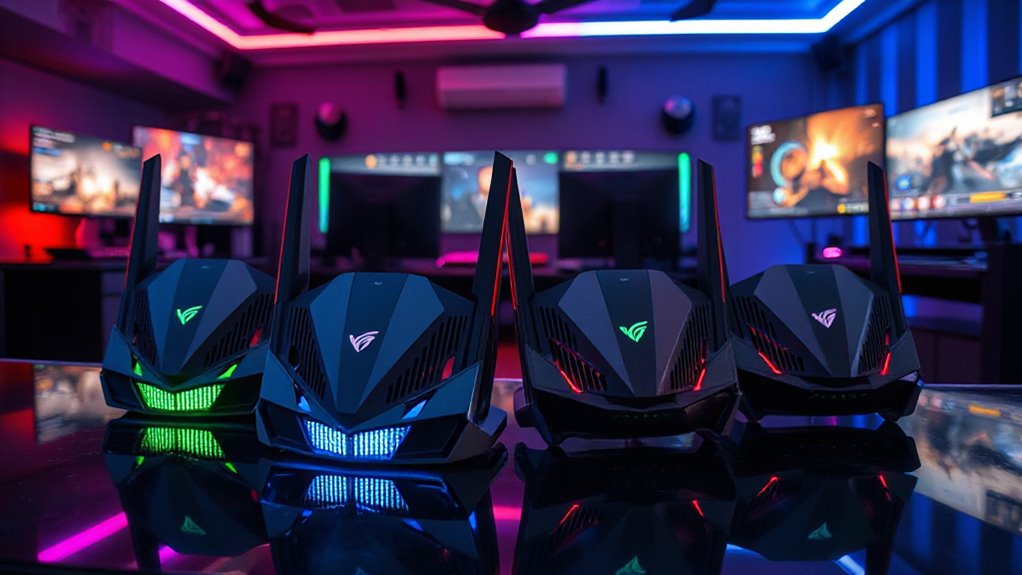 I’ve looked into the top WiFi 7 gaming routers for 2026, and the best models combine ultra-fast speeds up to 30 Gbps, advanced features like Multi-Link Operation and Beamforming, and extensive coverage with multiple multi-gig ports. They also include gaming-focused optimizations such as dedicated traffic prioritization and real-time monitoring. If you want to explore the details of these cutting-edge routers, stay tuned—there’s plenty more to discover.