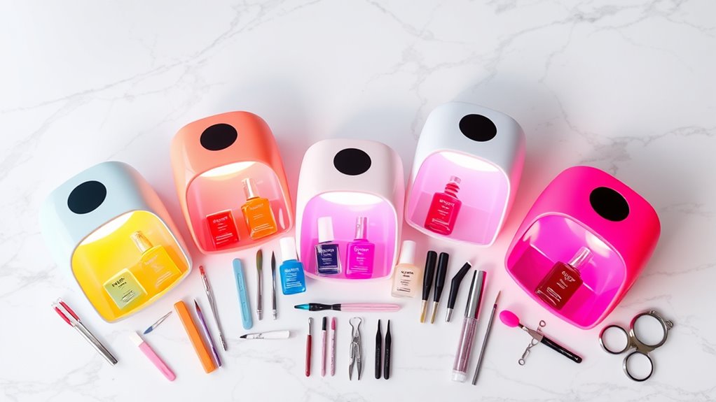 A high-quality curing light is essential for achieving professional-looking gel nails at home, especially for beginners. Look for a light with enough LED or UV bulbs to guarantee even curing across the entire nail surface. The wavelength should typically range from 365nm to 405nm, which is ideal for curing gel polishes efficiently. Quick curing times, like 30-60 seconds per layer, indicate a powerful light that saves time and reduces frustration. An automatic sensor that turns the light on and off when hands are inserted or removed adds convenience and helps prevent overexposure. Additionally, a durable, well-ventilated casing and adjustable timer settings contribute to safety and ease of use, making the whole process smoother for beginners mastering salon-quality nails at home.