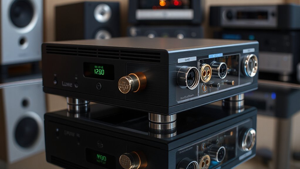 Choosing a hi-fi DAC with balanced outputs hinges on sound quality fidelity, which depends on several key factors. Balanced outputs generally offer lower harmonic distortion and noise, resulting in cleaner, clearer sound. High-quality DACs support higher sample rates and bit depths, capturing more detail and nuance in audio. Proper differential circuitry reduces electromagnetic interference and crosstalk, preserving audio accuracy. Additionally, the use of premium components like low jitter clocks and high-grade resistors ensures more precise, natural sound reproduction. Balanced outputs also improve channel separation and stereo imaging, creating a more immersive listening experience. When evaluating options, look for these technical features, as they directly influence the fidelity and overall audio quality you’ll enjoy from your setup.