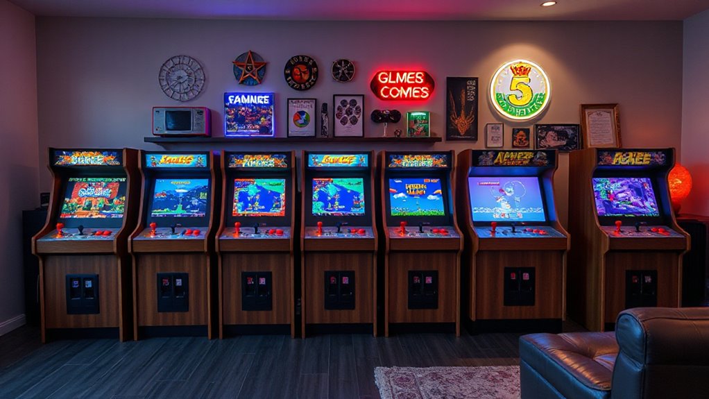 The power requirements for these home arcade units typically involve plugging into a standard 110V outlet, much like your household appliances. Most cabinets draw around 100-150 watts, so they’re energy-efficient. I recommend checking the specific model’s specifications to guarantee compatibility with your power setup. You’ll want a stable outlet and possibly an extension cord if your socket’s far away, but overall, they’re straightforward to power up.