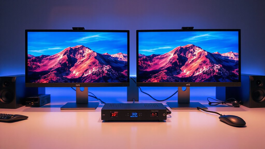 Choosing the right KVM switch for dual 4K 120Hz monitors requires making certain that it matches your devices’ connection types and specifications. First, check that the switch supports your cables, whether HDMI, DisplayPort, or USB-C, for smooth compatibility. Confirm your computers and monitors can handle 4K at 120Hz to match the switch’s capabilities. It’s also essential to verify that the switch provides enough USB ports and power options for all your peripherals. Additionally, make sure your devices’ operating systems—Windows, Mac, or Linux—are compatible with the KVM switch. Ultimately, match the switch’s input and output ports with your video and USB configurations to prevent connection issues. Paying attention to these details guarantees seamless switching without compatibility hiccups.