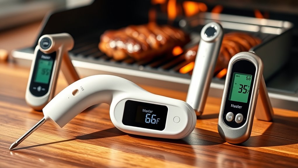 Think of choosing a meat thermometer like selecting a trusty lighthouse—guiding your grilling safely through the fog. The right device shines a clear beam, preventing overcooking and ensuring perfect results every time. Whether you prefer the steady glow of WiFi, Bluetooth’s close-range clarity, or the versatility of the Meater Plus, each lighthouse helps you navigate your grilling journey with confidence. With the right tool, your perfect steak is always just a beacon away.