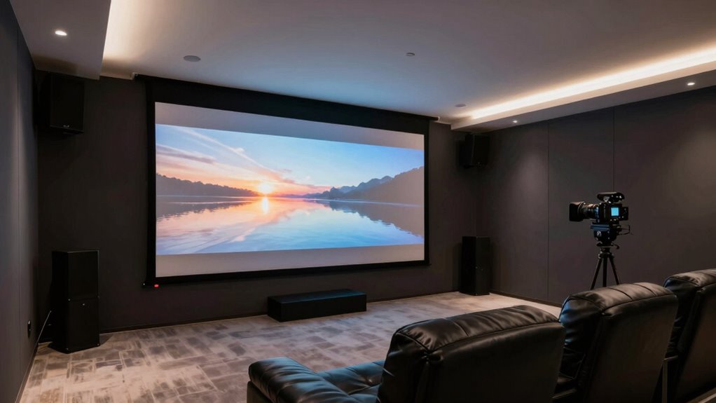 When selecting a motorized projector screen, ensuring compatibility with your specific projector type is vital. You need to verify that the screen works with your projector’s technology, whether it’s LED, LCD, or DLP. Checking the aspect ratio is also essential; match the screen’s ratio, like 16:9 or 4:3, to your projector’s native aspect ratio for a distortion-free image. Additionally, confirm the screen supports your projector’s resolution, such as 4K Ultra HD or 1080p, to preserve image quality. The size and viewing area should align with your room’s dimensions and throw distance for a perfect fit. Lastly, make sure the control system—remote, wall switch, or trigger—is compatible with your projector’s power and connection options for seamless operation.