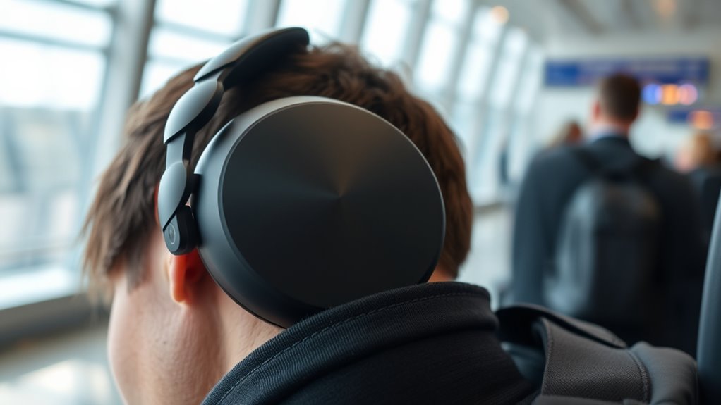Noise-canceling headphones can drain their batteries faster during extended travel because active noise cancelation requires continuous power. I’ve noticed that using them nonstop for hours can markedly reduce battery life, sometimes needing a recharge or replacement sooner than expected. To make them last longer, I turn off noise canceling when not needed and carry a portable charger. This way, I enjoy the silence without worrying about running out of power.