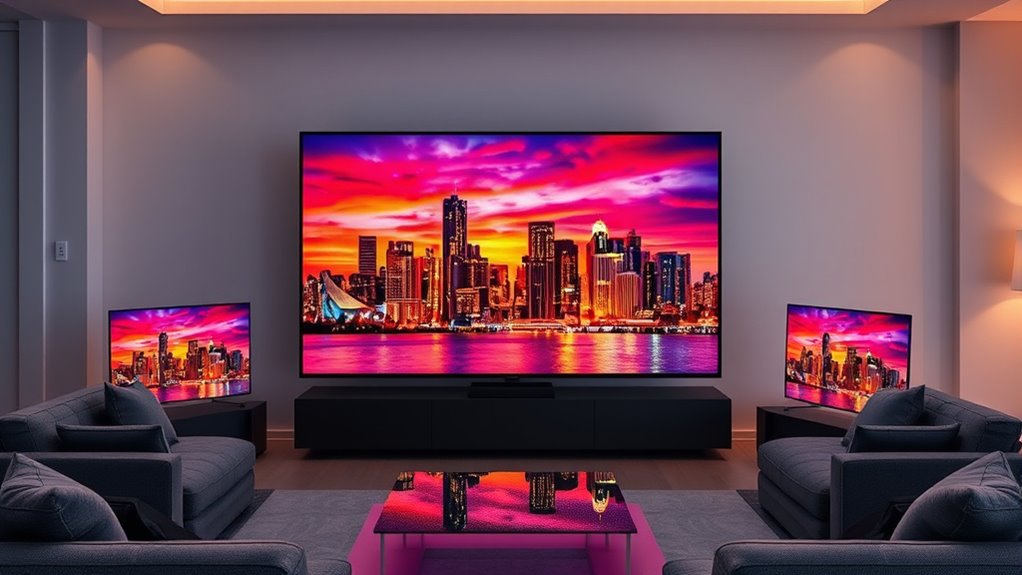 To get the best gaming experience from an OLED TV, you need to guarantee specific performance features that ensure smooth, responsive gameplay. A 120Hz or higher refresh rate is vital to reduce motion blur and deliver fluid visuals during fast-paced action. Look for models with a 0.1ms response time, which provides ultra-fast reactions perfect for competitive gaming. Compatibility with gaming-specific features like NVIDIA G-Sync, AMD FreeSync Premium, and VRR helps minimize screen tearing and stuttering. Multiple HDMI 2.1 ports are essential for connecting next-gen consoles and gaming PCs simultaneously. Additionally, dedicated gaming modes or dashboards allow you to customize settings, optimizing visuals and input lag for an enhanced gaming experience. Prioritizing these factors ensures you get the most out of your OLED TV during Black Friday deals.