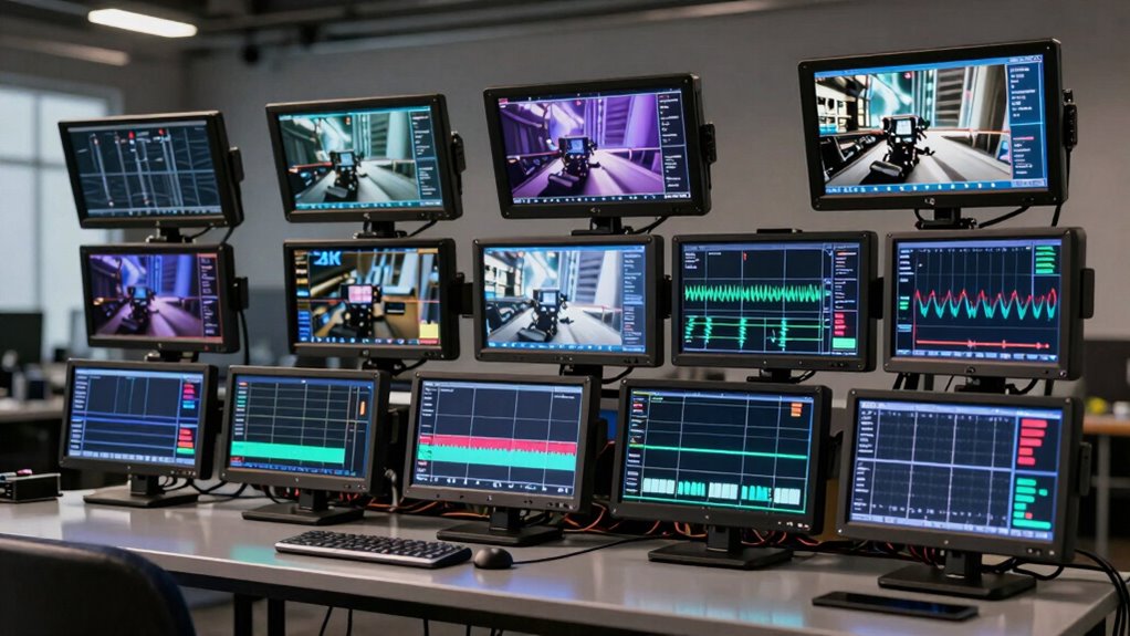 When selecting an on-camera field monitor, it’s vital to take into account the built-in tools that aid in achieving perfect exposure and focus. Professional monitors often feature waveform, histogram, and vectorscope, which provide real-time analysis of exposure and color accuracy. Features like false color, zebra stripes, and focus peaking help guarantee precise focus and proper exposure in varying lighting conditions. HDR support allows for better dynamic range, making it easier to see details in highlights and shadows. The ability to load and view custom 3D LUTs offers accurate color grading previews on set, streamlining post-production. These tools enable filmmakers to quickly assess and adjust image quality directly on the camera, reducing the need for external equipment and improving workflow efficiency.