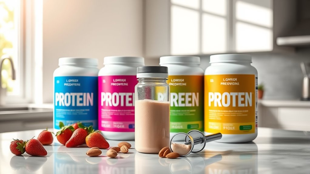 Think of protein powders as your hunger’s gatekeeper. They help control appetite by signaling fullness to your brain, making cravings less tempting. When I include a scoop in my day, I notice I stay satisfied longer, avoiding unnecessary snacking. Protein’s slow digestion keeps hunger at bay, giving me more control over my intake. It’s like having a reliable ally that helps me stay on track with my weight loss goals.