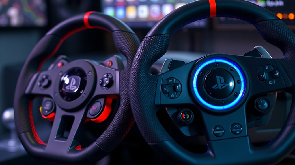 Choosing a racing wheel for your PS5 can be straightforward if you pay attention to compatibility. First, make sure the wheel explicitly states it works with PS5 to avoid connection issues. It’s also important to verify that the firmware is up-to-date, as updates can improve compatibility and performance. Check that the wheel uses a USB connection compatible with PS5 ports for smooth integration. Additionally, confirm that the driver requirements align with your system software and updates to prevent any driver conflicts. Finally, consider whether the wheel’s control features and software are optimized for PS5 racing games, ensuring you get the best experience. Being diligent about these compatibility factors helps you choose a wheel that works seamlessly with your console.