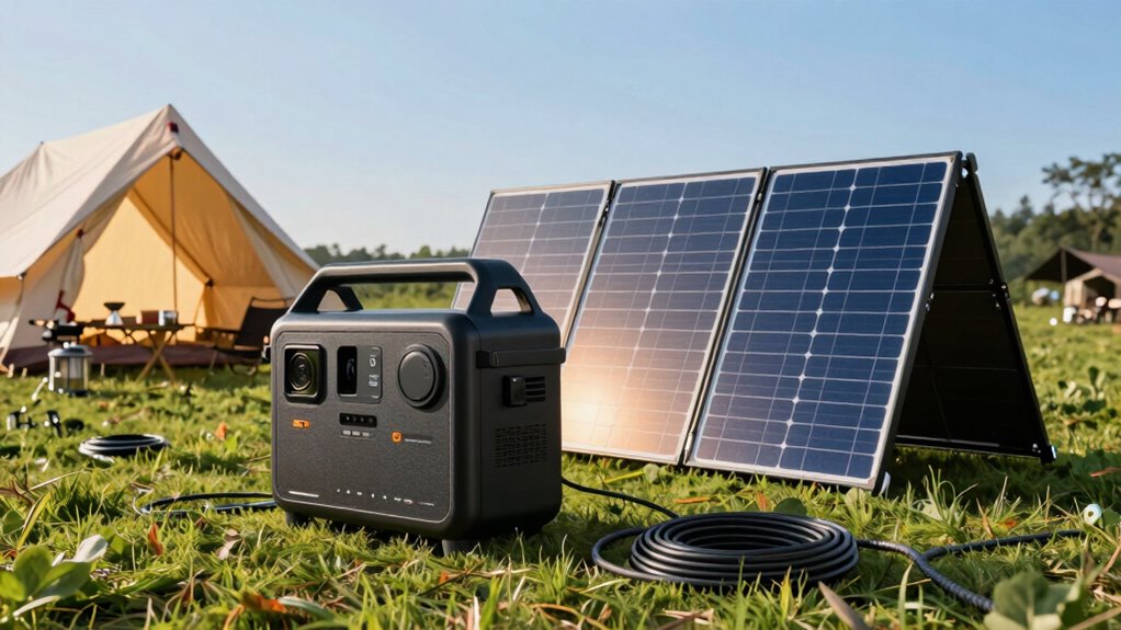 Ever wondered how quickly a solar generator can recharge during your camping trip? The key is selecting a model with fast recharging capabilities. Look for units that can reach 80% capacity in under 2 hours, saving you time and hassle. High wattage input options, like 1200W or more, allow faster solar or AC recharging, so you can get back to your adventure sooner. Multiple recharging methods—solar panels, AC outlets, and car adapters—offer added flexibility, ensuring you can recharge in various situations. Intelligent charging tech, such as MPPT controllers, optimizes solar energy conversion, reducing recharge time considerably. Additionally, fast-charging USB-C ports and AC outlets can cut down overall charging durations, making your camping experience more convenient and reliable.