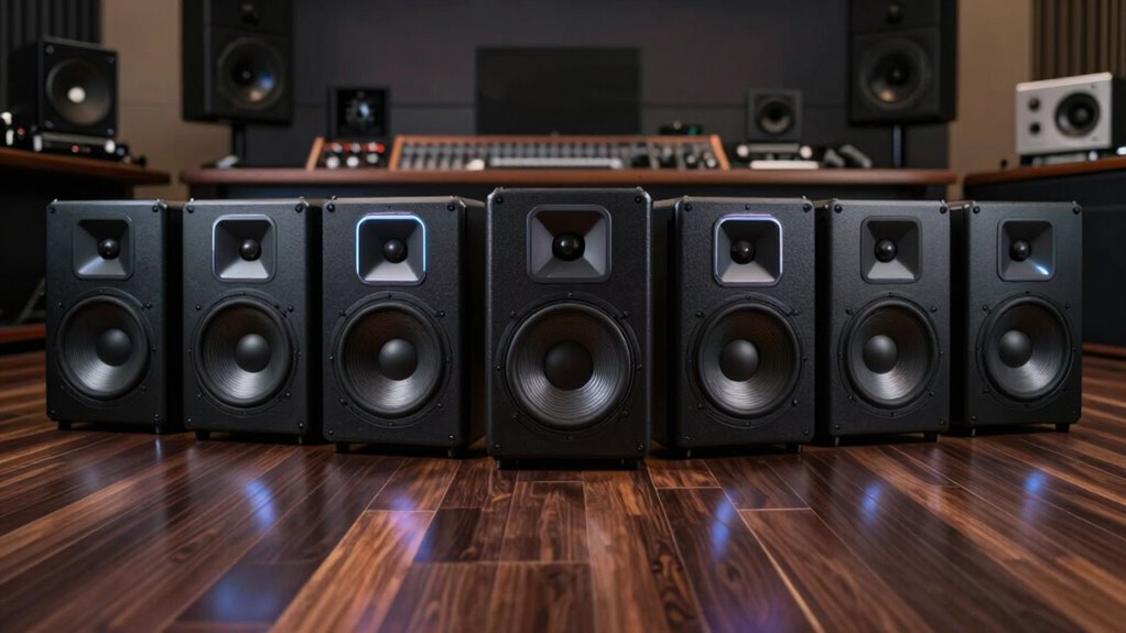 Choosing the right studio subwoofer is like finding the perfect lighthouse in a foggy night—guiding your mixes with clarity and confidence. It’s not just about power or size, but about how it illuminates your sound landscape. When you select the right sub, you’re forging a path through the sonic darkness, ensuring every beat, bassline, and nuance shines brightly. Trust your instincts; let your choice be your guiding light in this musical voyage.