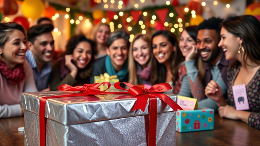 To avoid offending someone with your gift, I always choose something lighthearted and universal, steering clear of sensitive topics. I pay attention to the guest list and avoid anything too personal or controversial. If I’m unsure, I opt for funny or practical items that most people can appreciate. Ultimately, I remember it’s all about having fun, so I keep my gift playful and respectful to guarantee everyone leaves smiling.