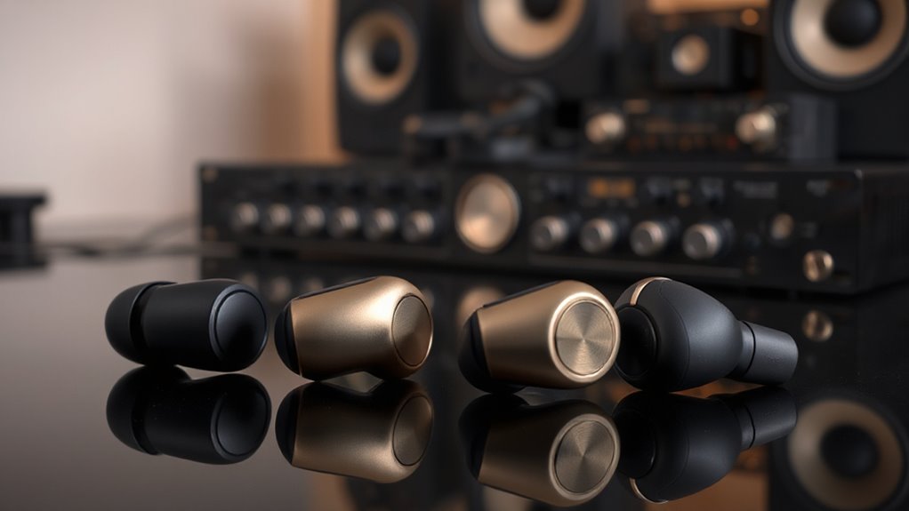 To achieve exceptional sound quality in wireless earbuds, you need to look beyond basic features and focus on the technical aspects that guarantee clarity and richness. High-resolution audio codecs like LDAC, aptX Lossless, or Hi-Res Wireless are essential for delivering crisp, detailed sound. Multiple drivers, such as dynamic and balanced armature types, work together to produce a well-balanced, immersive listening experience across all frequencies. Precise acoustic tuning, including a broad soundstage and clear instrument separation, enhances realism. Support for certifications like Hi-Res Audio Wireless indicates the earbuds meet rigorous standards for audio fidelity. Additionally, customizable EQ settings and adaptive sound profiles allow you to tailor sound performance to your personal preferences, ensuring every listening session is optimized for audiophile quality.