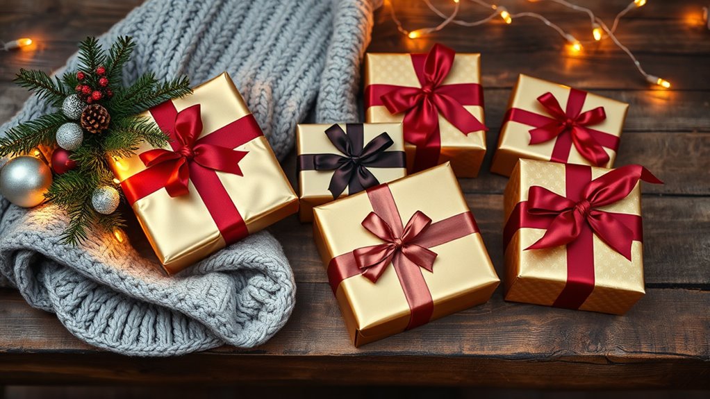 Keeping product quality in mind is important, but staying aware of current trends and styles guarantees your gift feels fresh and fashionable. By paying attention to popular colors, patterns, and materials, you guarantee your present aligns with modern aesthetics and cultural preferences. Monitoring social media platforms and design reports helps spot emerging styles gaining popularity, making your gifts feel relevant and stylish. Trends in technology, like smart devices and eco-friendly products, also influence what’s considered desirable and fashionable. Additionally, offering versatile, minimalist, or statement pieces aligns with current design movements and appeals to a wide range of tastes. Incorporating these trends ensures your gifts are not only thoughtful but also in tune with contemporary fashion, making them truly special for everyone on your list.