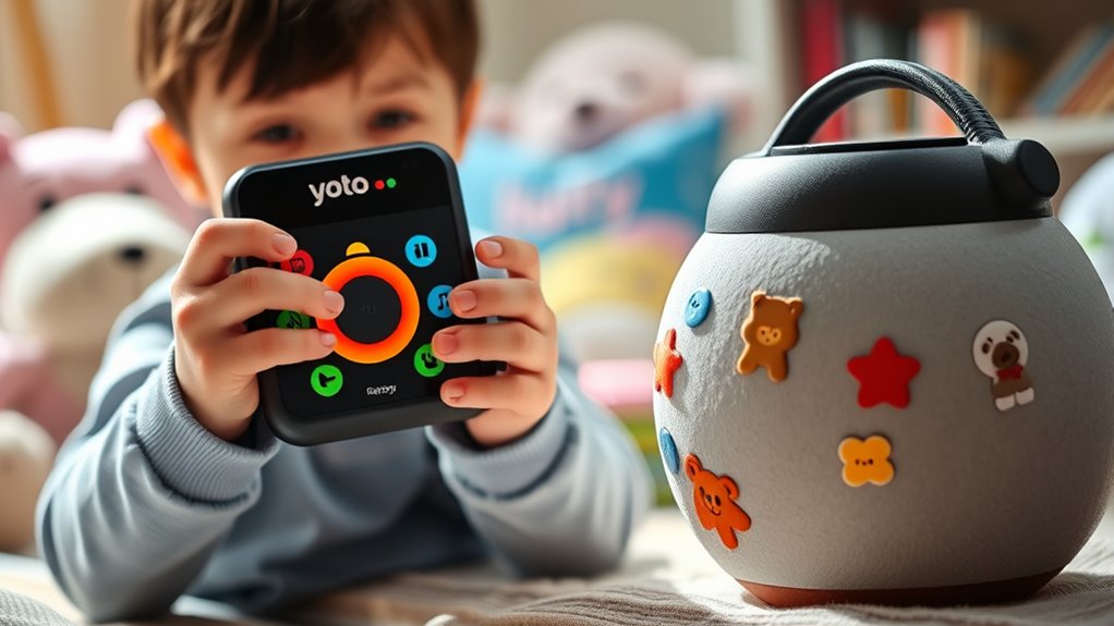 Both the Yoto Player and Toniebox are designed to grow with your child, offering a range of customization options that keep their listening experience fresh and engaging. Yoto supports Make Your Own cards, allowing kids to upload and create personalized audio content, fostering creativity and ownership. Toniebox, on the other hand, offers a variety of themed Tonies—stories, songs, and interactive games—that can be added or swapped as interests evolve. The Yoto ecosystem is highly expandable, providing access to podcasts, soundscapes, and educational activities, supporting ongoing learning. Both systems support age-appropriate content, which can be tailored to your child’s developmental stage and changing preferences. This flexibility guarantees the device remains relevant and exciting as your child grows.